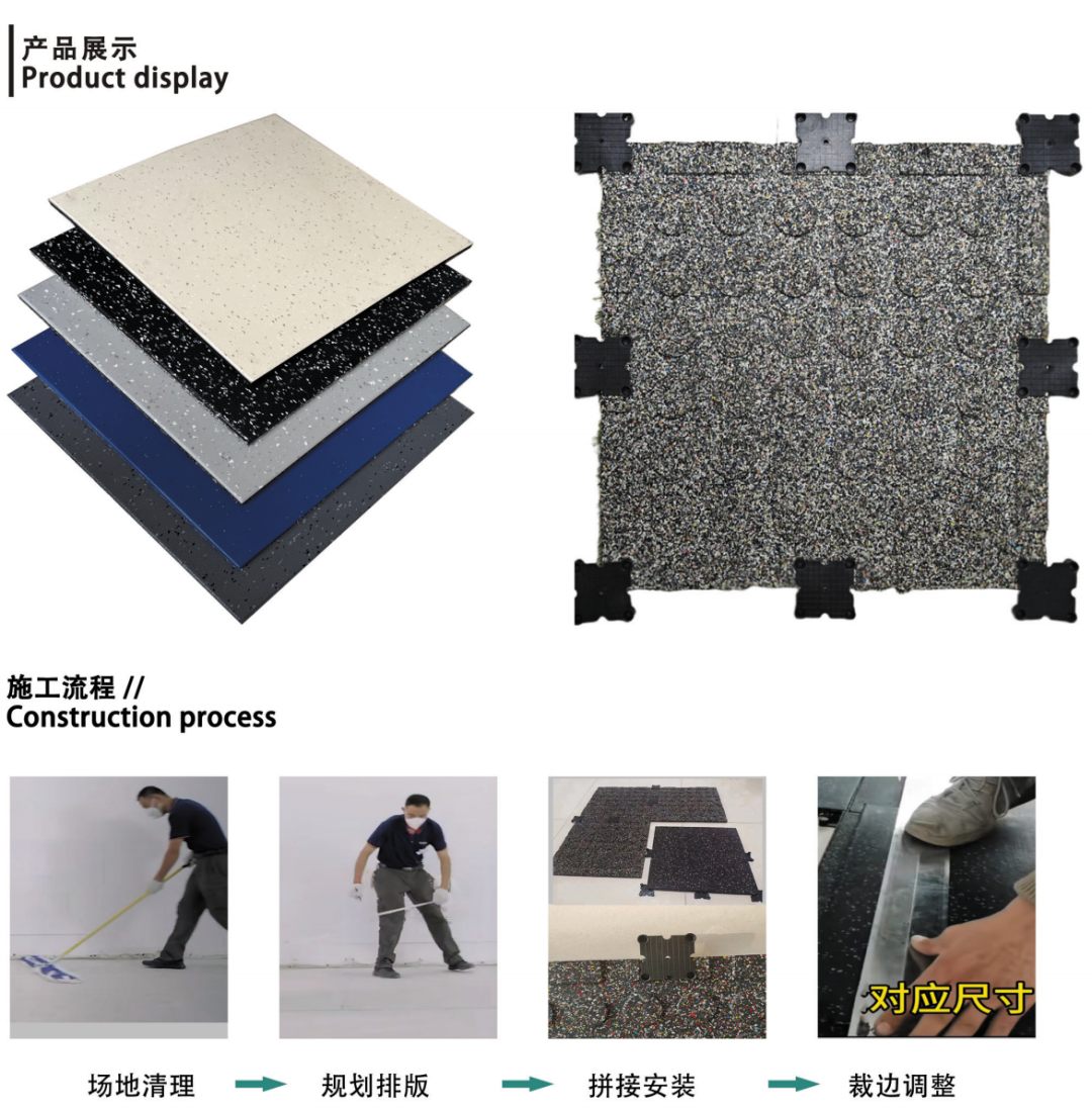特点: 产品抗压、耐冲击、摩擦系数大有弹性,减震防滑、防护性能强; 耐候及耐温性能好、抗紫外线性强,在-40C-100C范围内可正常使用,可满足不同场所的需求; 表面不积水,易清洗、保养; 隔热、隔音、抗静电、阻燃安全系数高; 对人体无刺激,无污染,防霉,不滋生微生物,6.拼接无缝更美观。