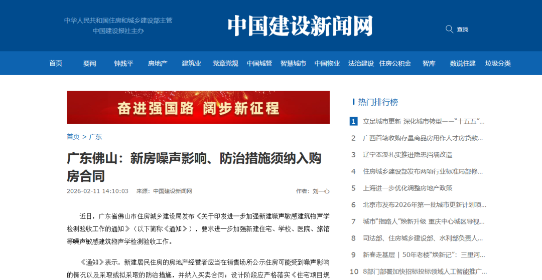 2026年2月11日,佛山市住房城乡建设局发布《关于进一步加强新建噪声敏感建筑物声学检测验收工作的通知》,明确要求:新建住宅噪声影响、防治措施须纳入购房合同,并在销售现场公示,从设计、检测、验收到销售全链条强化建筑声学管控,切实将“宁静人居”的要求落到实处,推动住宅品质升级,保障购房者合法权益。